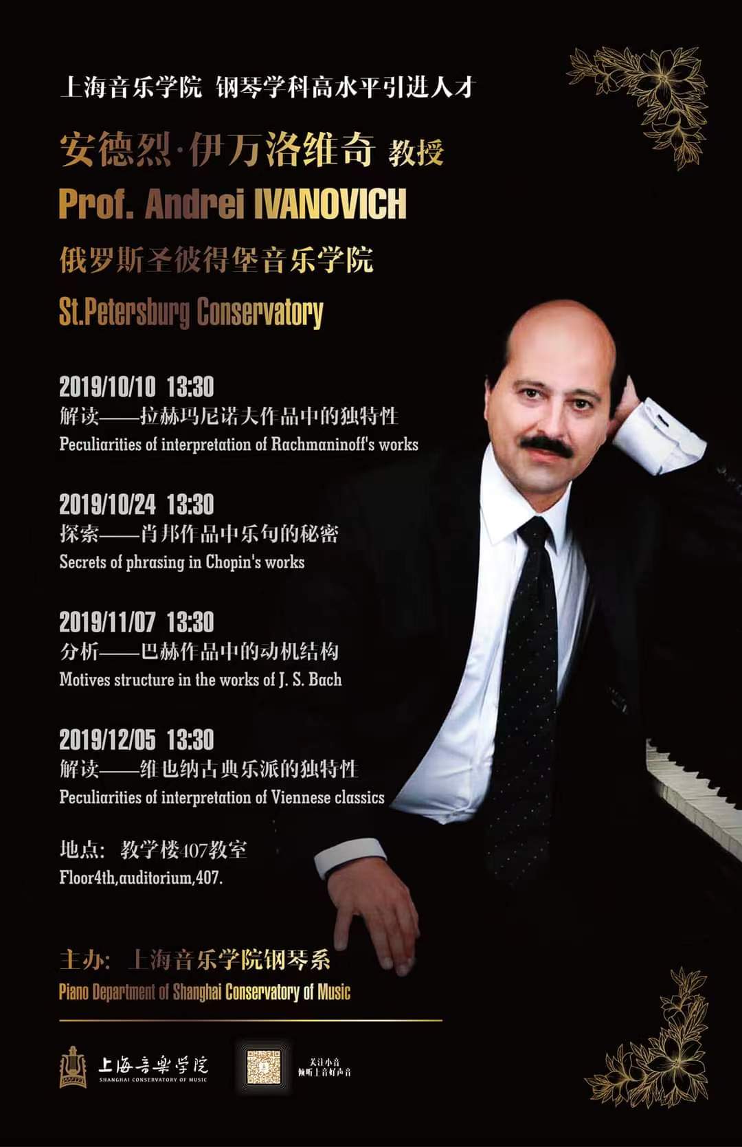 安德烈·伊万诺维奇,俄罗斯钢琴家、教育家,毕业于俄罗斯圣彼得堡国立音乐学院、莫斯科音乐学院和德国卡尔斯鲁厄高等音乐学院,曾获得多项国际著名钢琴比赛冠军。他的演出足迹遍布世界各地,同时也是俄罗斯肖邦协会的成员、德国拉赫玛尼诺夫协会理事会成员,以及柴可夫斯基国际音乐节的官方代表。
